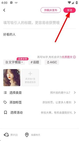 4、在发布准备页面,填写标题等信息后,点击发送,发布内容。