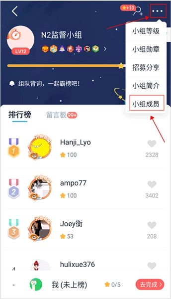 1、在小组界面后点击右上角三个点形状的按钮,打开小组选项,选择其中的“小组成员”