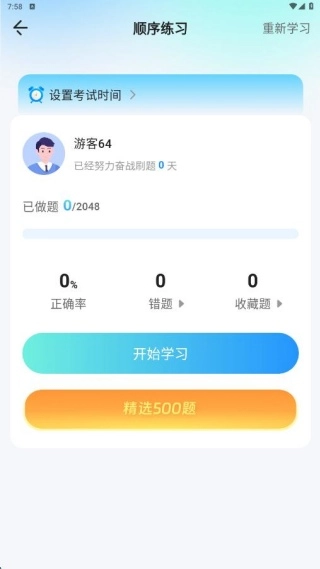 4、在顺序练题,知晓个人答题情况,点击开始学习,进行刷题操作。