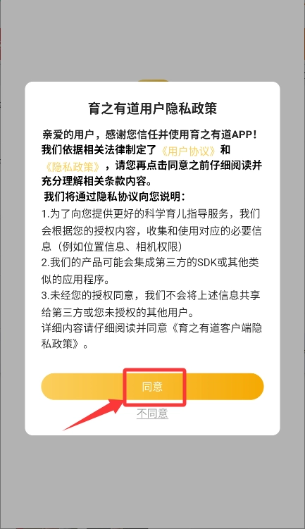 1、首次启动应用,请在用户隐私政策弹窗点击同意。