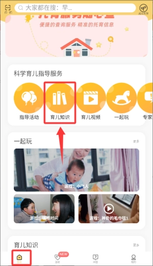 3、首页进入科学育儿板块选择育儿知识功能。