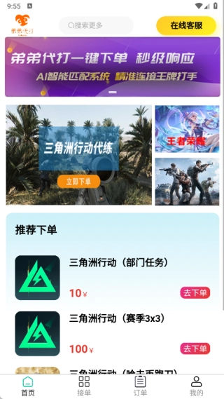 1、在首页中有三角洲行、王者荣耀以及和平精英游戏的代练,玩家可以随时进行下单;