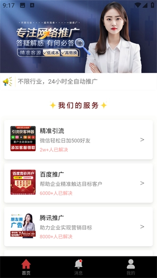 4、登录成功后在首页可以看到相应的推广服务渠道入口,按照需求使用即可。