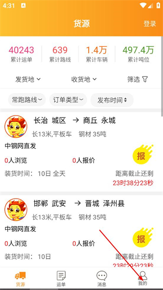 2、在物流宝货源页面,点击底部我的,进入登录相关界面。