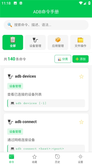 3、所有ADB命令依据不同的功能场景予以分类,像设备管理、应用调试、性能分析、文件操作之类都涵盖其中。