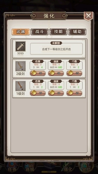 拥有武器后,就可以开启冒险之旅啦!点击“冒险”按钮进入关卡选择界面,再点击对应的关卡就能进入战斗环节!