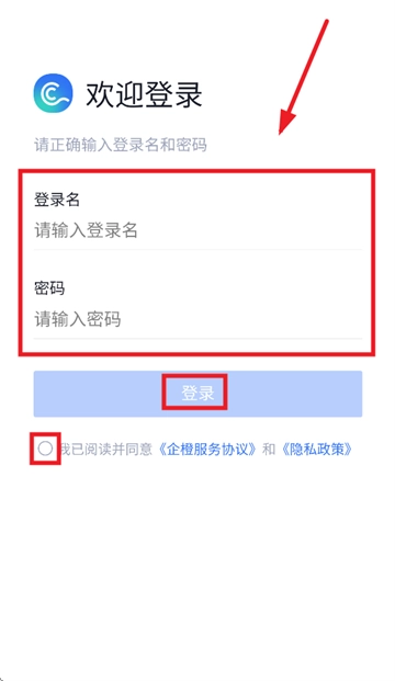 请输入登录名和密码,勾选“我已阅读并同意《企橙服务协议》和《隐私政策》”后,点击登录按钮即可完成登录操作。