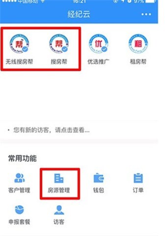 2、在首页点击“房源管理”选项后,可从中选择“搜房帮推广”或“无线搜房帮推广”这两个推广方式。