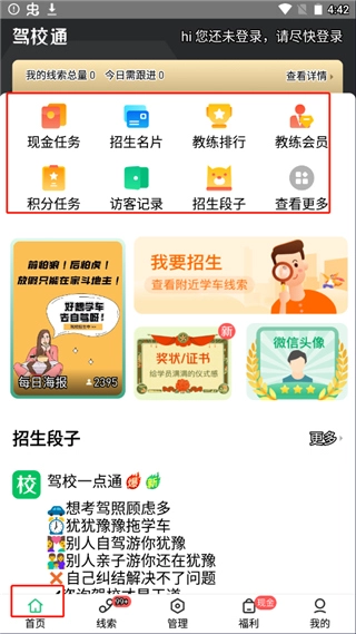 1、打开本站的驾校通招生管理助手并进入首页后,能看到现金任务、招生名片、驾校排行、招生段子等功能;