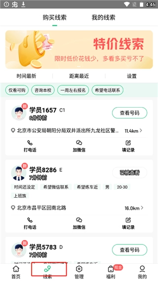 2、点击线索,教练可以观看到最新的学员报名线索;