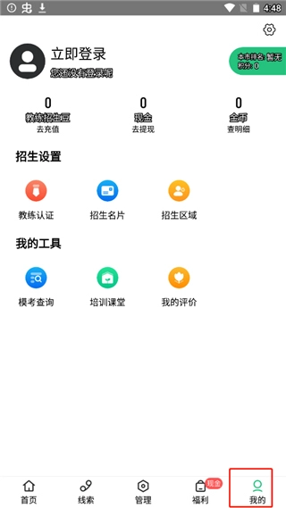 4、点击我的,里面为用户提供了金币数和现金数还有各种教练认证和招生名片。