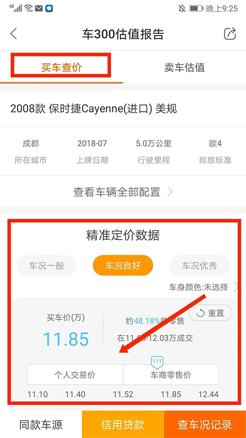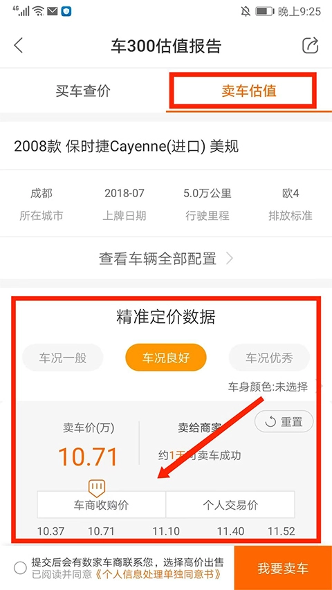 4、进入【卖车估值】界面,可看到当前车辆的卖车价、车商收购价和个人交易价,