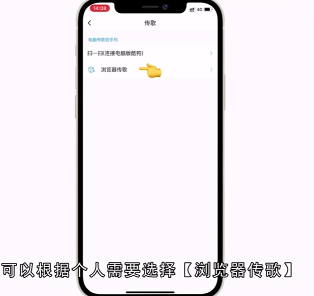 3、在极速传歌界面,你可以选择通过浏览器传歌,这需要确保电脑和手机连接着同一个WiFi;也可以选择扫描二维码来连接电脑版酷狗音乐,以此完成传歌操作。