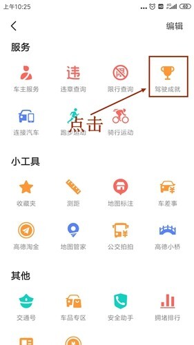 我们打开软件,在导航主界面下拉,点击工具箱,来到工具箱的界面,然后找到驾驶成就,点击这个功能。