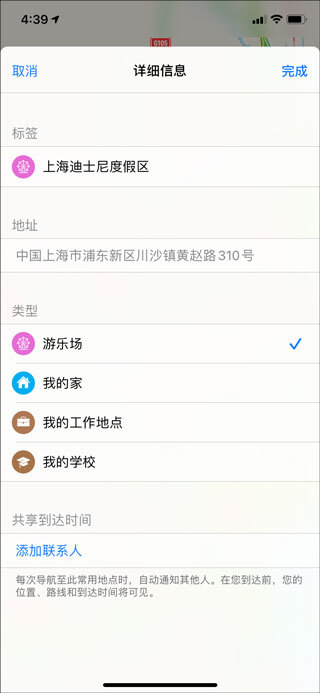4、进入详细信息界面,在这里选择类型,以及添加联系人之后,点击完成: