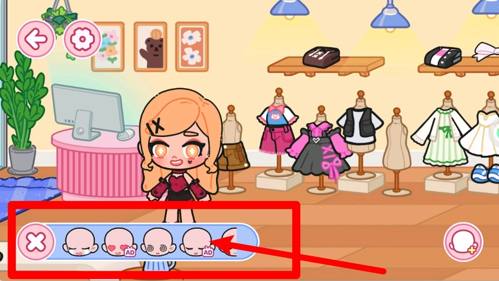 2.服装店中点击右下角头像可更换,脸型与表情带AD款式需看广告解锁才能使用。