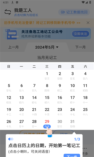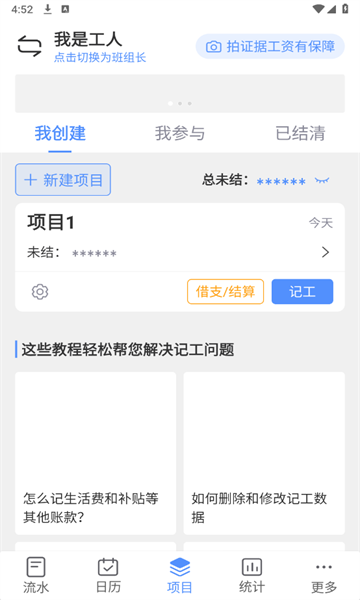 建筑工友可以自主选择创建个人记工本或班组记工本,轻松解决建筑工地记工天、记工时、工地记账、考勤管理等日常工作问题,助力为建筑工友提供高效的办公服务,让大家切实体验到在线记工天、记工时的便捷。