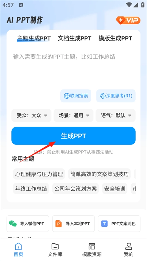 3、一键生成:在PPT里输入题目或提纲,系统就能自动完成PPT的内容与结构搭建。