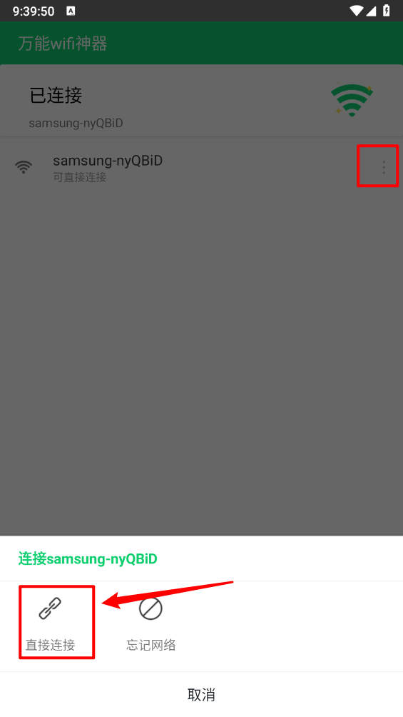 3、如图所示,系统会自动扫描周边的WiFi网络,找到目标热点后点击其右侧的三个点图标,此时会弹出操作弹框,在弹框中选择“直接连接”选项即可完成连接。
