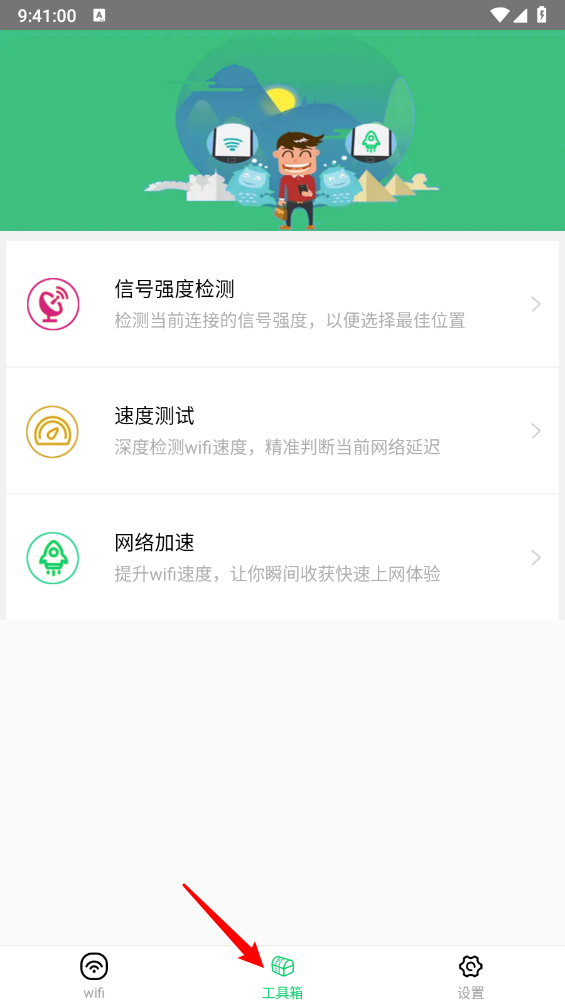 4、切换至"工具箱"板块,可以进行信号强度检测、速度测试和网络加速。