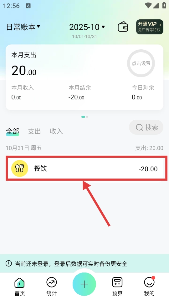 4、完成记账后,在主界面可查看本月支出等账目信息,如餐饮支出20.00元的记录。