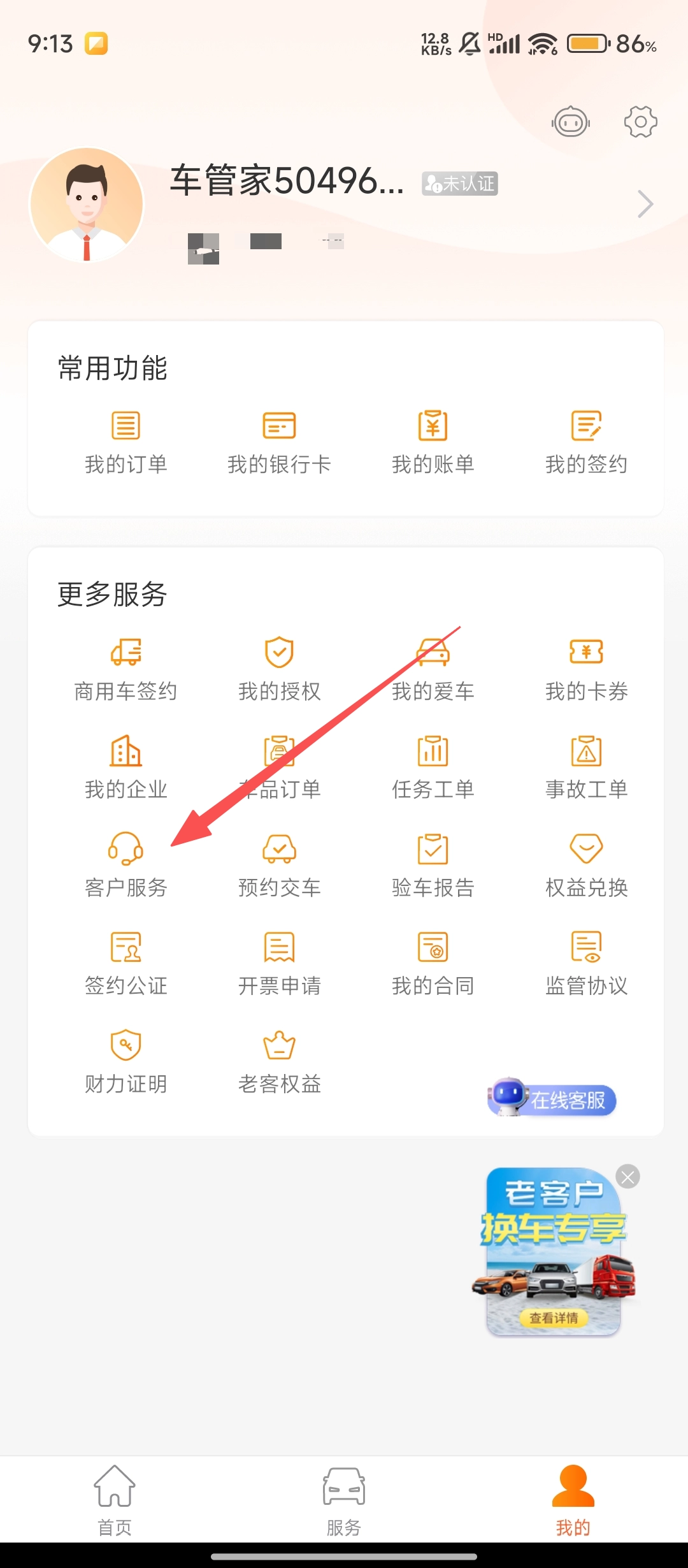 在个人中心页面的【更多服务】板块里,找到【客户服务】选项并点击,即可进入服务大厅,获取各类用车服务支持。