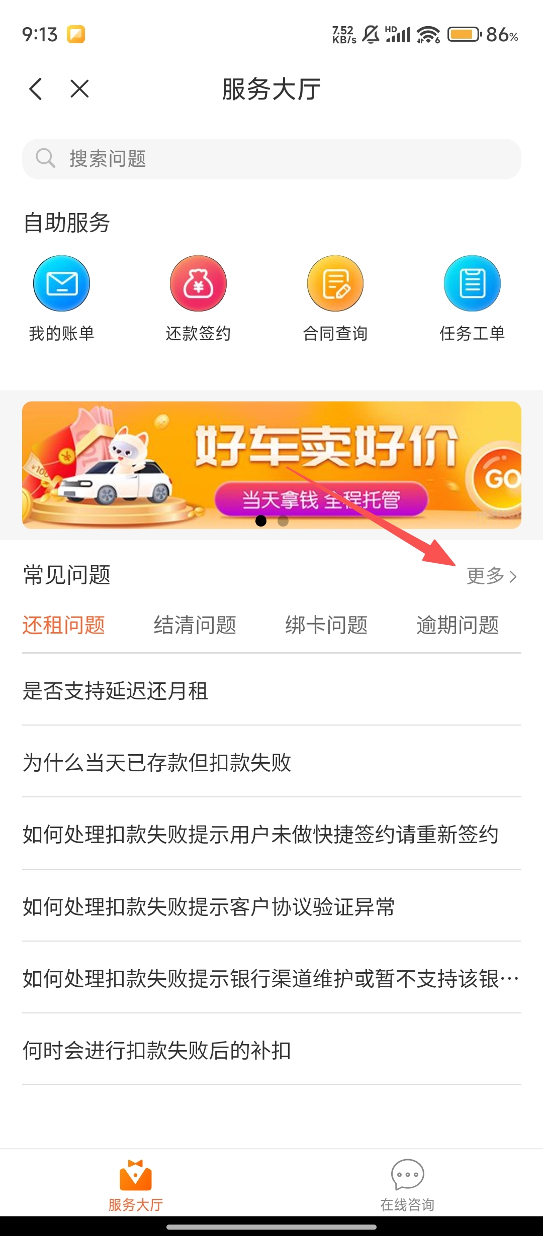 3、进入服务大厅后,在【常见问题】板块找到【更多】按钮并点击,就能查看更多分类的用车疑问解答,让你获得更全面的解惑。