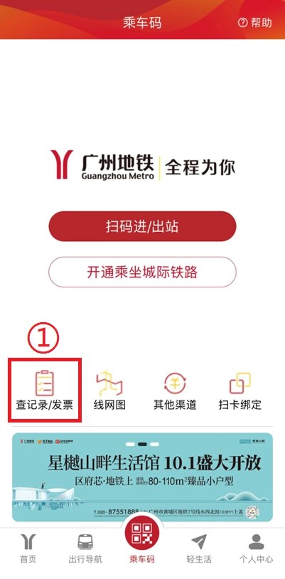 1、打开广州地铁,点击首页【查记录/发票】按钮