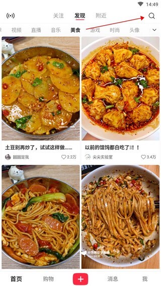 进入软件后,可选择上方的美食分类,进入美食页面后能看到大量美食分享内容,也可通过点击右上角的搜索功能查找你感兴趣的美食信息。