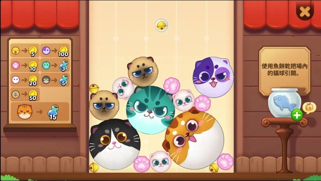当猫球不断溢出,触及最上方的“红色警戒线”时游戏便宣告结束,最终奖励会依据游戏界面左侧的「奖励兑换规则」进行结算。