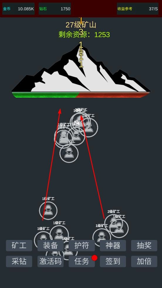 1、进入27级矿山界面,查看剩余资源后,派遣不同等级矿工前往矿山,开启资源挖掘,为获取金币等资源奠定基础。