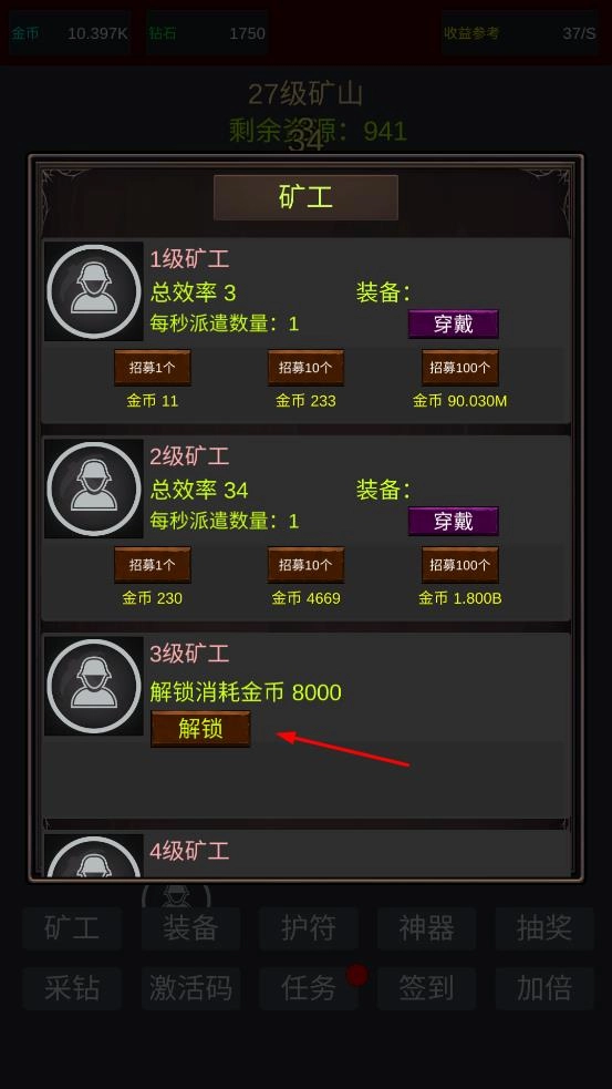 2、在矿工界面,消耗金币招募1级、2级等矿工,也可消耗指定金币解锁更高级矿工,提升挖矿效率。