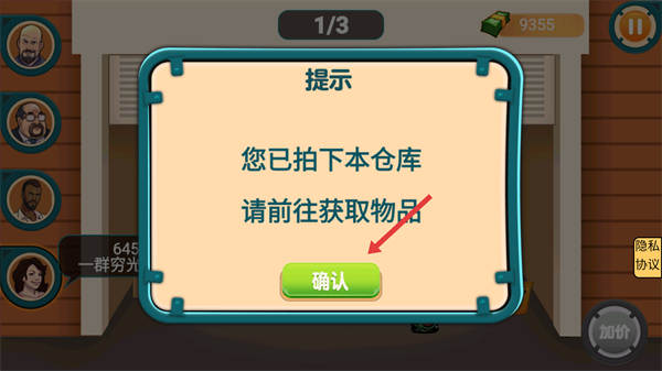 4、竞拍成功后,会弹出提示弹窗,点击【确认】按钮,即可前往该仓库获取对应的物品奖励。