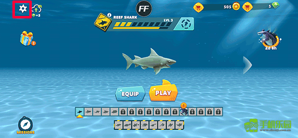 1、打开饥饿的鲨鱼进化,在游戏主界面找到并点击左上角的“齿轮”按钮;