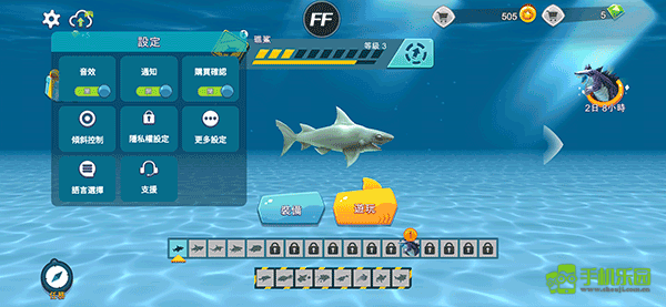 3、游戏采用触摸与重力感应双操作模式,上手简单轻松。每条鲨鱼都对应着专属任务等待玩家完成,此外还有15个散落在地图各处的隐藏任务待你探索,玩家可通过达成成就来获取高额分数与额外金币奖励!