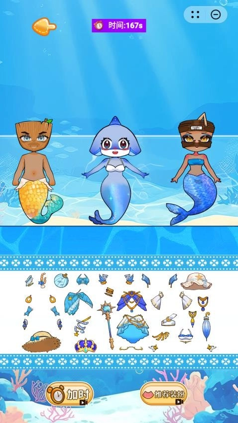 4、在每本手账里都能看到三条美人鱼,你可以为她们准备需要的服饰,而且还能在贴纸中找到对应的搭配材料。