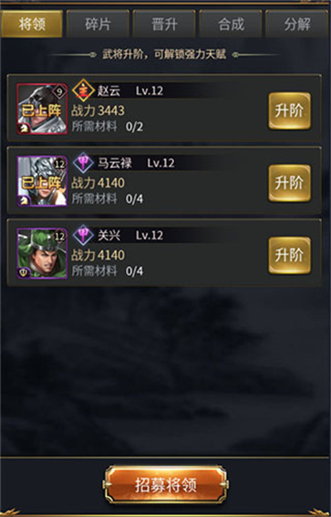 4.武将培养 每个玩家能上阵的武将数量存在上限,这个上限会随着玩家等级的提高而增加,最多可以有20位武将同时上阵。当武将阵位达到上限时,不少玩家都会纠结该重点培养哪些武将,以及具体的培养方法。 武将培养的基础要点,首先是尽量优先为武将搭配好绝配组合。绝配属性的激活,需要依靠武将之间的羁绊关系,同时给武将配备对应的神兵、坐骑、珍品、副将和美人等。至于天赋,则需要通过将武将升阶突破来激发。这里要特别说明的是,游戏设置了免费重生功能,十分人性化,就算突破操作失误,或者需要更换其他武将培养的玩家,也完全不用为此担心。最后是晋升功能,这个功能能够帮助玩家提升武将的品级。