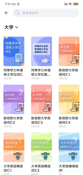 1、新用户会进入单词书推荐页面,可根据分类标签引导,选择自己想学的单词书。