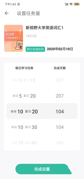 2、选定单词书,设置每天的任务量(新词数+复习词数),确认无误后,点击【完成设置】按钮。