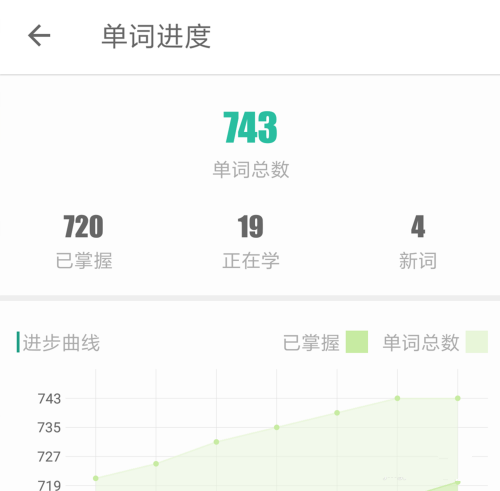 3、在单词进度的页面中,可以看到自己学过的单词总数量。