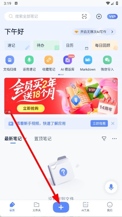 1、打开,进入首页后,点击底部中间的+按钮,开始创建新笔记。