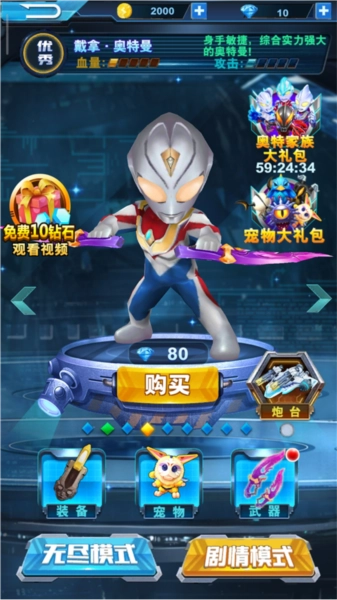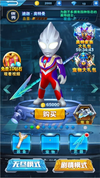 游戏里收录了梦比优斯、迪迦、赛罗、欧布等众多广为人知的奥特曼英雄,解锁之后还能对它们进行升级,升级可以提升英雄的血量与攻击力。