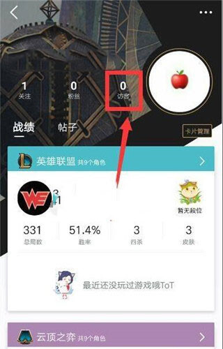 3、在战绩和互动中心里,昵称与头像的下方设有“关注”“粉丝”“访客”三个选项,若想查看具体记录,直接点击对应的选项进入即可。