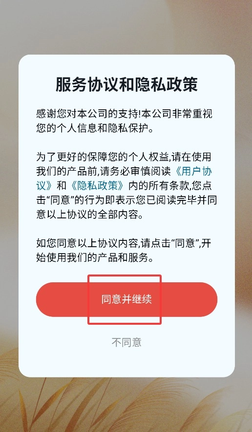 1、首次启动应用时,请点击弹窗中的同意选项,方可进入主界面开始使用。