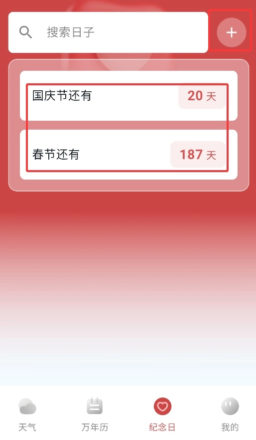 4、进入纪念日页面后,可添加倒数日事件,自动计算距离节日的剩余天数。