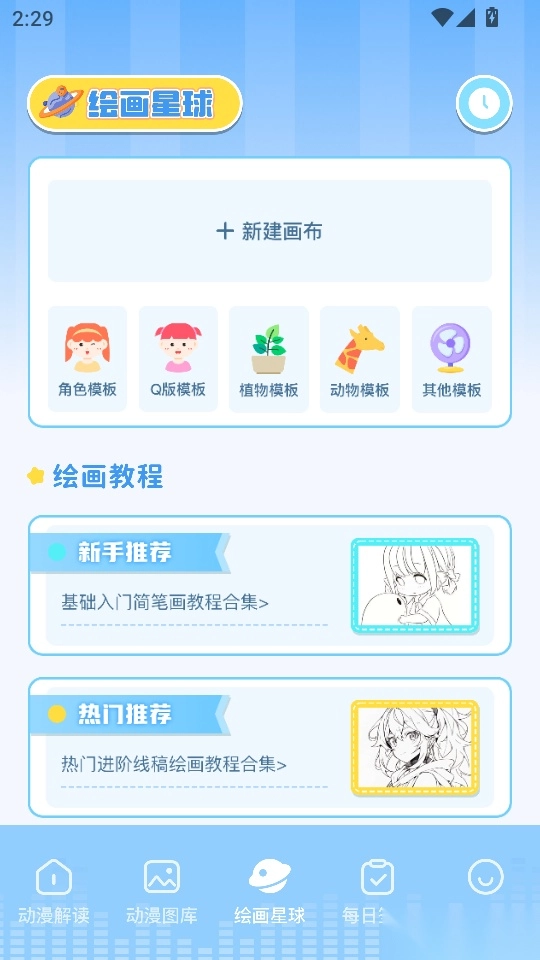 3.在“绘画星球”功能菜单界面,点击“+新建画布”按钮以进入下一步操作。
