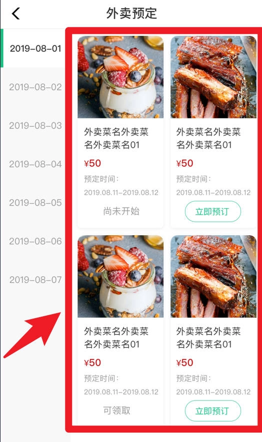 5、外卖预订页面会依据日期呈现可供选择的餐品,用户能够提前下单预约,以保证在指定时间取餐或者享用送餐服务。