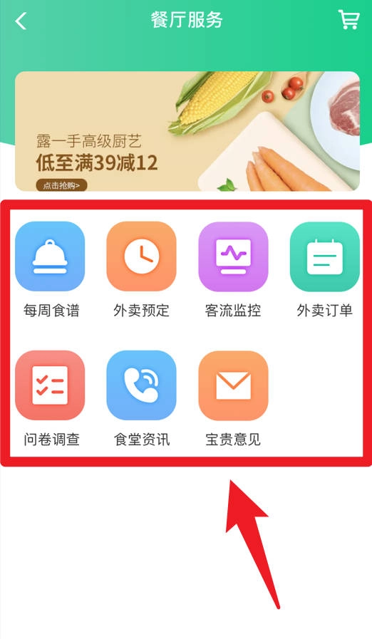 4、进入餐厅服务界面后,可使用每周食谱、外卖预定、客流监控、问卷调查及意见反馈等功能。