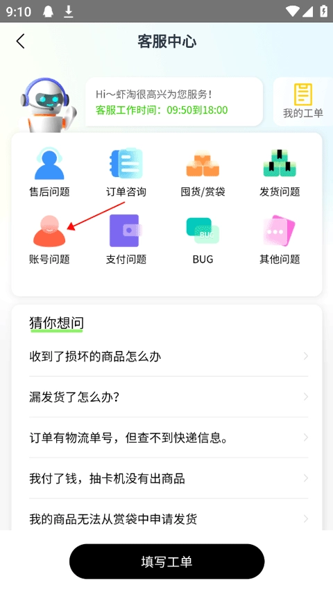 2、在客服界面中选择【账号问题】分类。