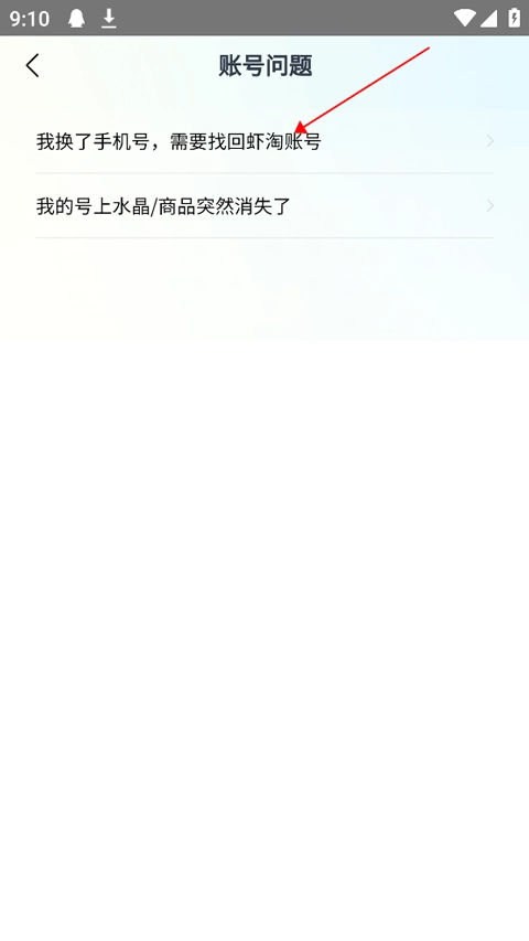 3、进一步选择 “我换了手机号,需要找回虾淘账号” 的需求。